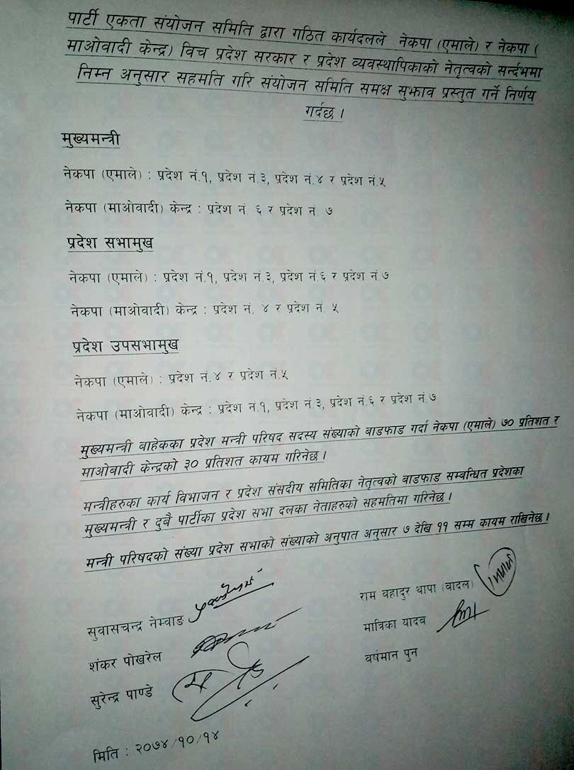 यसरी मिल्यो एमाले -माओवादीको भागवण्डा (सहमति पत्रसहित)